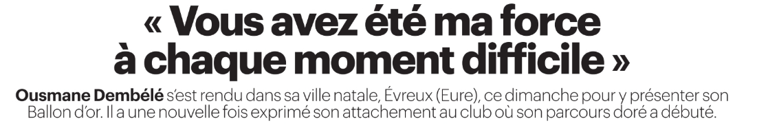C’était une belle fête pour Dembélé et la ville d’Evreux de pouvoir profiter de ce Ballon d’Or ensemble, entre cérémonie, festivités et discours. Il faut savourer pleinement, ces moments sont rares. Cela peut même servir au joueur pour la suite afin d’avoir des ressources en plus. On espère, en tout cas, le voir revenir en pleine forme après sa blessure. Il est question d’un retour dans le groupe le 17 octobre pour PSG/Strasbourg, sans certitude encore.