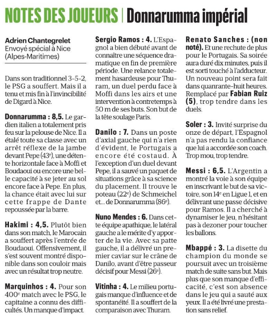 Donnarumma a fait de beaux arrêts, mais rien d’exceptionnel. Il fallait être là, il a répondu présent, ce qui n’est pas le cas de tout le monde dans cette équipe. Il a imposé son gabarit et a eu des gestes intéressants. Le PSG peut le remercier, dans ce match sous tension, il a évolué à un très haut niveau. C’était important.