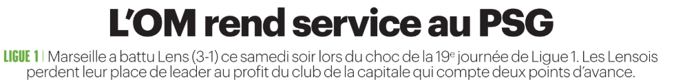 Ce dimanche 25 janvier, la presse française (sur l’aspect sportif) s’est concentrée du côté du Paris Saint-Germain sur la première place de Ligue 1 récupérée grâce à la victoire de l’OM contre le RC Lens (3-1) hier soir, la période plus compliquée de Senny Mayulu (milieu de 19 ans) et l’appel du Collectif Ultras Paris à la présence de supporters marseillais lors du Classico le 8 février (21e journée de Ligue 1).