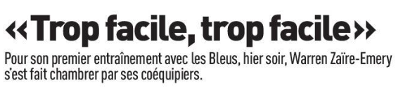 Zaïre-Emery n’est pas en difficulté pour son premier rassemblement avec les Bleus, il ne ressort que du positif du contenu sportif et l’ambiance semble être bonne autour du jeune Titi. Espérons que cela se confirmera sur le terrain.