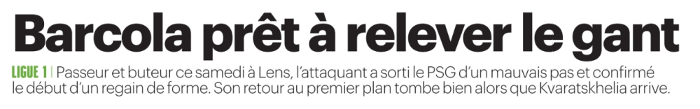Ce dimanche 19 janvier, la presse française (sur l’aspect sportif) s’est concentrée du côté du Paris Saint-Germain sur la victoire compliquée à Lens (1-2) hier dans le cadre de la 18e journée de Ligue 1. Le dernier match avant la réception de Manchester City mercredi en Ligue des Champions, avec un Bradley Barcola (attaquant de 22 ans) décisif. Il y a aussi Randal Kolo Muani (attaquant de 26 ans) qui attend toujours d’être prêté à la Juventus Turin.