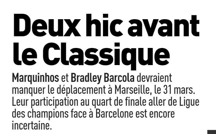Ce dimanche 24 mars, la presse française (sur l’aspect sportif) s’est concentrée du côté du Paris Saint-Germain sur la défaite des Bleus contre l’Allemagne en amical qui concerne 5 joueurs (Lucas Hernandez, Warren Zaïre-Emery, Ousmane Dembélé, Randal Kolo Muani et Kylian Mbappé, retrouvez notre analyse ici), ainsi que les blessures de Marquinhos (défenseur central et capitaine de 29 ans) et Bradley Barcola (attaquant de 21 ans) avec des forfaits quasi sûrs pour la reprise dimanche prochain contre l’Olympique de Marseille (27e journée).