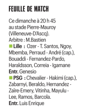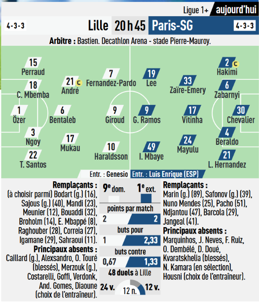 Il y aura cependant de nombreuses absences importantes (Marquinhos, Fabian Ruiz, João Neves, Désiré Doué, Ousmane Dembélé et Khvicha Kvaratskhelia). Ce qui n’empêche pas d’avoir une équipe intéressante. Et l’espoir d’un beau match, avec des Lillois qui ont généralement un jeu offensif servi par de belles qualités. Il y a en plus le coup de pression de l’Olympique de Marseille, provisoirement premier après la victoire 0-3 à Metz hier.