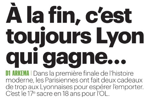 Ce samedi 18 mai, la presse française (sur l’aspect sportif) s’est concentrée du côté du Paris Saint-Germain sur la défaite 2-1 hier soir contre l’Olympique Lyonnais lors de la finale du playoff de D1 Féminine, ainsi que le mercato des deux équipes premières (sans grande nouvelle) et le projet du nouveau stade (sans grande avancée).