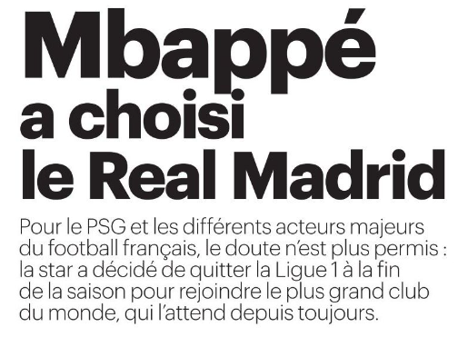Mbappé aurait décidé, mais il garde la décision secrète et le journal écrit « affirmer que c’est fait serait faux ». On n’avance donc pas vraiment. Il fallait une Une qui marque un peu les esprits et dans ce dossier c’est du 50-50 alors cela peut se tenter. Comme d’autres médias avant, dont les rumeurs n’ont pas été concrétisées. Peut-être que l’attaquant va vraiment partir, sauf qu’il n’y a rien de concret et donc pas de certitude. Restons calmes et prudents, en espérant que le dossier sera bientôt bouclé. Peu importe l’issue.