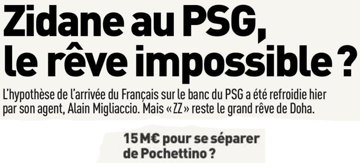 Qui sera le prochain entraîneur du PSG ? Zidane ? Galtier ? Une surprise ? Chaque jour des choses sont dites, puis démenties. Zidane semblait proche et son agent est venu taire cette rumeur. On connait le poker menteur dans le football et on est en plein dedans. Le rêve impossible ? Non, il paraît que le technicien français garde un pied au PSG mais rien n’est signé. Tout d’abord, il faudra faire partir Pochettino, à 15 millions d’Euros. C’est le point de départ avant l’arrivée d’un nouveau staff.