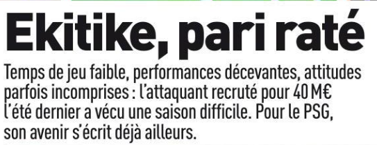 Ce n’est pas vraiment Ekitike, le Pari raté, c’est bien le projet parisien 2022/2023, le pari raté. Ekitike a montré des failles importantes dans son jeu. Il ne faut pas le nier. Mais dans sa gestion, il a été totalement démoli par les agissements de Christophe Galtier. Jamais sur le terrain, l’ancien Rémois n’a jamais pu prouver à son entraîneur et à tous les suiveurs. Il a été totalement mis de côté par un système sans concurrence.