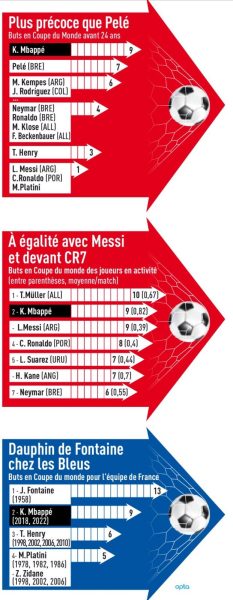 Mbappé a des chiffres phénoménaux. Il marque, et marque encore. Ce n’est que sa deuxième Coupe du Monde, il est déjà le meilleur jeune de moins de 24 ans, à avoir marqué le plus de buts. Il est aussi le deuxième joueur en activité avec le plus de but en Coupe du Monde (9) juste derrière Thomas Muller (10). Il pourrait devenir très vite le meilleur buteur de l’histoire de la Coupe du Monde. Encensé de toute part, il réalise pour le moment une belle Coupe du Monde qu’il veut valider avec la victoire finale.