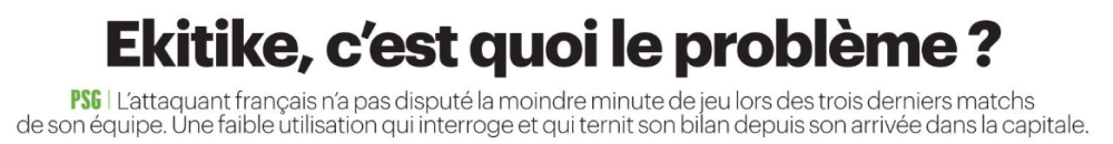 De toute façon, sa saison est déjà un échec. Qu’il n’ait pas joué depuis trois matchs est juste un constat, mais cela ne change rien. Il y a deux lectures (voire trois). La première, Ekitike est loin du niveau exigé au PSG, il est encore très tendre et brouillon. La seconde, Galtier cherche à resserrer ses lignes, après le terrible mois de mars, et donc a décidé de se passer d’un attaquant.