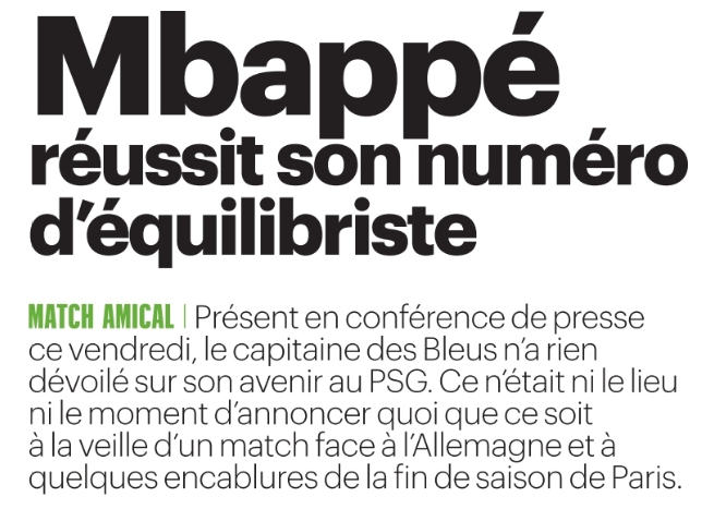 Ce samedi 23 mars, la presse française (sur l’aspect sportif) s’est concentrée du côté du Paris Saint-Germain sur la conférence de presse Kylian Mbappé (attaquant de 25 ans) avec l’Equipe de France hier avec aucun indice sur son avenir, un sélectionneur Didier Deschamps qui apprécie que le joueur joue un peu moins que d’habitude et la blessure de Bradley Barcola (attaquant de 21 ans) avec les Espoirs. Il y a également un petit mot sur Ousmane Dembélé (attaquant de 26 ans) qui devrait tirer les coups de pied arrêtés en l’absence d’Antoine Griezmann en Bleus.