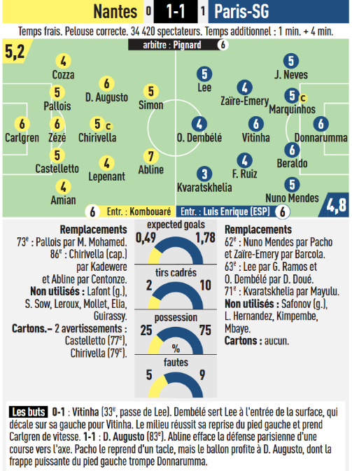 Il y a la gestion de l’effectif avant tout en pensant à la suite. Et des records qui sont une motivation, mais ce n’est pas la même chose que jouer des titres. Aussi, il faut accepter qu’il y a des moments un peu moins bien. Notamment dans la finition. Le PSG n’a pas raté son match et n’était pas loin de gagner. Sans oublier qu’il y a également un adversaire et Nantes a bien résisté afin d’accrocher un point pour le maintien.