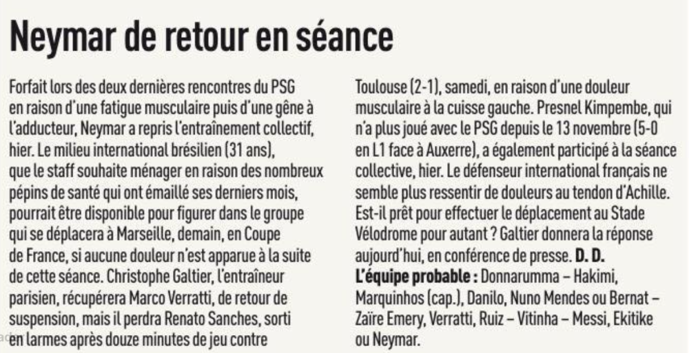 Pour Neymar, le retour semble proche et loin à la fois. Est-ce que Galtier prendra le risque de le faire jouer 48 h après son retour avec le groupe et 7 jours avant le Bayern Munich (tout en sachant qu’il y a le déplacement à Monaco entre les deux) ? Ce n’est pas certain, pourtant son apport pourrait être essentiel.