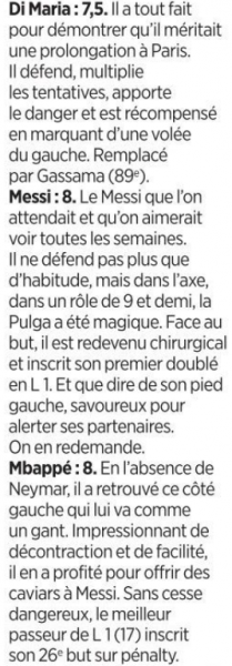 Les notes du journal Le Parisien, résument bien le match des parisiens sur la pelouse de Montpellier. Le trio d’attaque, une fois n’est pas coutume, a été très bon, pendant que Donnarumma a passablement inquiété sur certaines relances et que Gigi Wijnaldum ne s’en sort pas et termine le match avec ce sentiment, une nouvelle fois, d’être passé à côté. On retiendra que le PSG a réalisé un match plein, rare cette saison et que la victoire ne souffre d’aucune contestation.