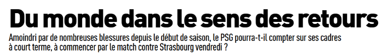 Enfin, le groupe parisien devrait retrouver des forces pour la réception de Strasbourg ce vendredi. Mais il n’y a rien de nouveau dans L’Equipe, on attend encore afin d’être sûr de la situation de chacun.