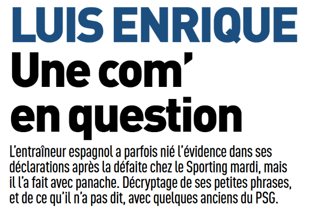 Quant à la communication de Luis Enrique, cela ne valait pas un tel effort du journal sportif et on ne va pas y consacrer beaucoup de lignes. Il est satisfait du jeu, c’est logique compte tenu de la domination. Mais le coach sait bien qu’il y a des choses à améliorer, que les attaquants doivent de nouveau mettre des buts ensemble. Il garde simplement les correctifs, voire remontrances, pour la vie au club. Il n’a pas à tacler dans les médias, ce n’est pas nouveau. Mais il fallait bien un angle de critique.