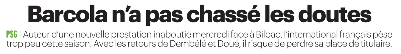 Ce vendredi 12 décembre, la presse française (sur l’aspect sportif) s’est concentrée du côté du Paris Saint-Germain sur les difficultés rencontrées par Bradley Barcola, attaquant de 23 ans du Paris Saint-Germain, alors qu’il a déçu lors du match nul 0-0 contre l’Athletic Bilbao (6e journée de Ligue des Champions).