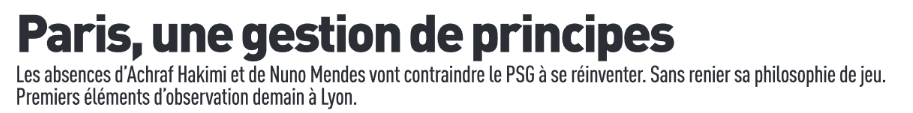 De toute façon, il aime que ses joueurs s’adaptent un peu à toutes les situations. Ce ne sera pas simple demain à Lyon sans Désiré Doué, Ousmane Dembélé, Hakimi et Mendes. Notamment parce que ces deux derniers ont un profil particulier. Cependant, on ne s’inquiète pas. La philosophie de Luis Enrique est bien installée et il y a des solutions dans l’effectif.