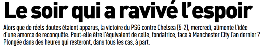 Bien sûr, le PSG a remporté une victoire importante et il faut savourer. Cependant, on s’amuse autant que l’on s’agace de voir les médias faire comme si Paris avait eu un contenu vraiment différent des matchs précédents. La domination est moins claire, mais l’efficacité a été particulièrement élevée. Sauf que les médias mélangent contenu et résultat. Attention, on ne dit pas que ce n’était pas un bon match. Mais ce n’est pas un grand réveil par rapport à avant.