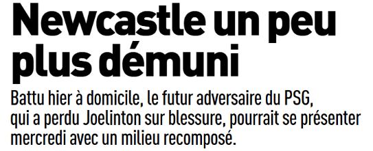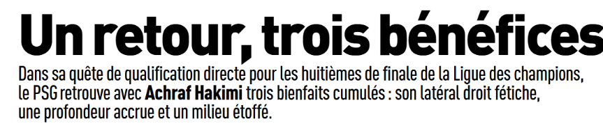 Ce lundi 26 janvier, la presse française (sur l’aspect sportif) s’est concentrée du côté du Paris Saint-Germain sur le retour à la compétition d’Achraf Hakimi (latéral droit de 27 ans) qui pourrait se faire contre un Newcastle diminué au milieu ce mercredi (8e journée de Ligue des Champions) et l’arrivée quasiment officielle de Dro Fernandez (milieu de 18 ans du FC Barcelone).