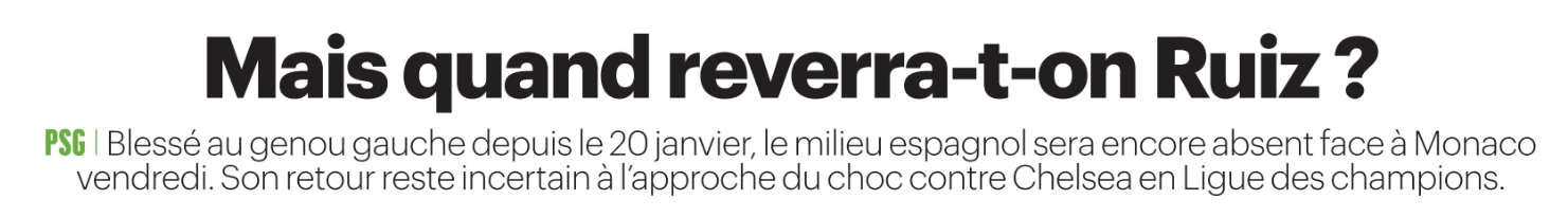 Il est difficile de dire quand Ruiz sera de retour exactement, avec un coup au genou qui s’est transformé en blessure qui traîne. Cela arrive, malheureusement, avec une articulation qui peut être difficile à soigner. Il peut ne pas s’agir de quelque chose de grave, mais une douleur reste embêtante et doit être soignée pleinement. Le journal évoque une incertitude pour les 8es de finale de Ligue des Champions contre Chelsea les 11 et 17 mars, mais l’espoir n’existe presque pas. Il y a 5 jours, le PSG a évoqué « 2 semaines » de soins. Ce qui nous amène déjà au 13 mars, alors qu’il ne pourra peut-être pas s’entraîner avec le groupe tout de suite.