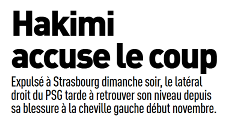 Rien d’anormal après avoir enchaîné durant la CAN alors qu’il revenait de blessure. On comprend que sa méforme soit évoquée, mais le journal sportif n’avait pas vraiment besoin de nous préciser que le PSG « reste serein ». Il n’y a pas soudainement des doutes sur les qualités du latéral. Simplement, il faut du temps pour retrouver tous ses moyens, sans oublier l’impact mental de la défaite en finale. Rien d’alarmant. Même si on regrette son carton rouge évitable dimanche à Strasbourg, synonyme de suspension (au moins) contre l’OM.