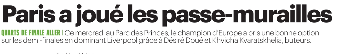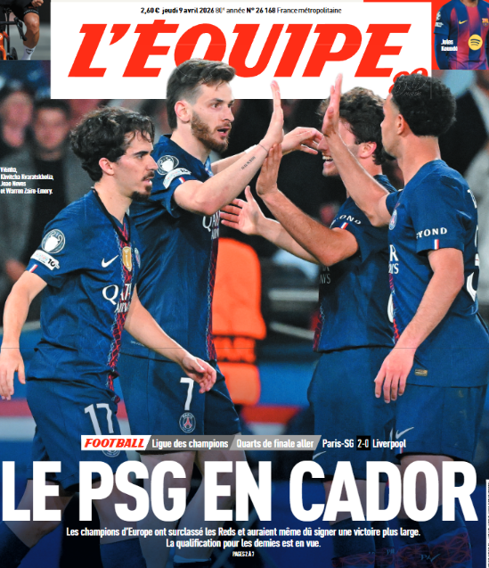 Ce jeudi 9 avril, la presse française (sur l’aspect sportif) s’est concentrée du côté du Paris Saint-Germain sur la victoire 2-0 hier soir contre Liverpool au Parc des Princes en quart de finale aller de la Ligue des Champions 2025-2026 (retour le 14 avril à Anfield).