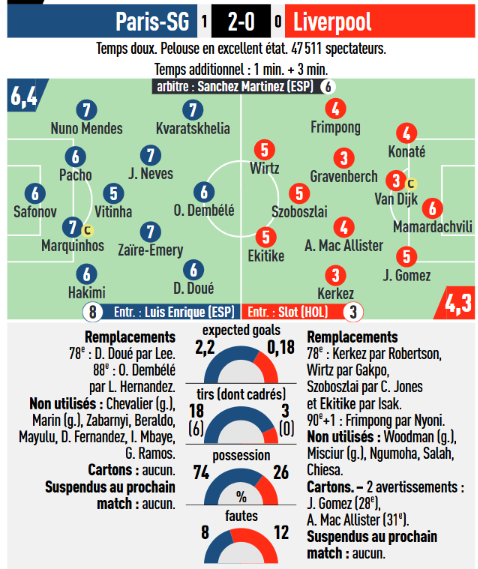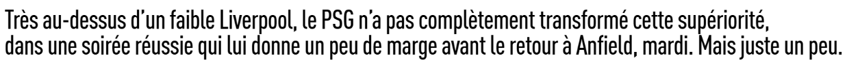 C’est assez simple à constater, beaucoup plus difficile à faire sur le terrain : le PSG a été bien meilleur que Liverpool. L’énergie collective, la possession, les duels, les performances individuelles…tout est en faveur de Paris. Le score pourrait même être un peu plus sévère si les Parisiens avaient été encore plus justes dans la finition.