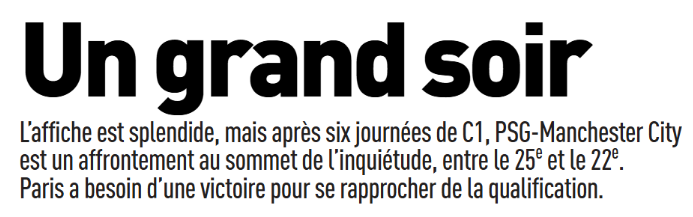 Ce mercredi 22 janvier, la presse française (sur l’aspect sportif) s’est concentrée du côté du Paris Saint-Germain sur la réception de Manchester City ce soir à 21h dans le cadre de la 7e journée de la phase de la Ligue des Champions. Le PSG va notamment compter sur ses cadres Ousmane Dembélé (attaquant de 27 ans) et Achraf Hakimi (latéral droit de 26 ans). Il y a aussi le duel entre les coachs et amis Luis Enrique et Pep Guardiola, qui ont une idée du football très similaire.