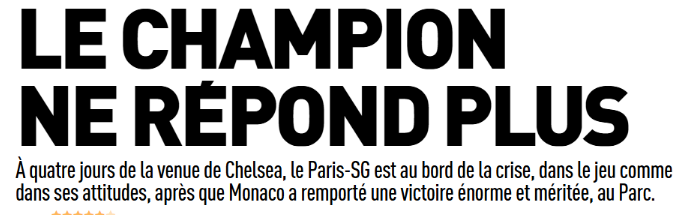 Difficile de passer à côté de l’évidence, le PSG s’est raté et prend encore une petite claque cette saison. Une punition ou un réveil ? On aime la seconde idée, avec un groupe qui a souvent su réagir. Mais il y a quelques interrogations sur ses ressources physiques et mentales afin de le faire. Il y a eu trop d’imprécision hier, avec un manque de spontanéité. Le coach Luis Enrique ne l’a pas caché, le groupe manque de confiance.