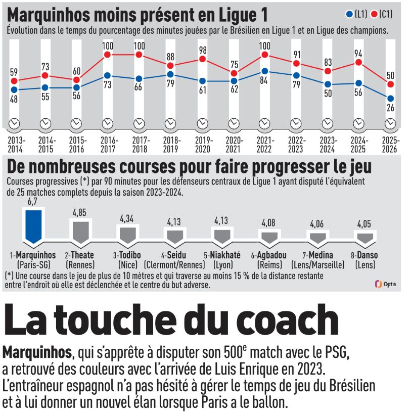 Ce sera face à Marquinhos, qui profite bien de la présence de Luis Enrique afin de se relancer pleinement et se placer parmi les meilleurs. Dans un meilleur collectif, le défenseur est moins en train d’essayer de rattraper des situations compliquées. Il a aussi plus d’options dans le jeu et en profite pour s’illustrer. Le tout avec une gestion qui évite la surcharge. Il va atteindre les 500 matchs au PSG, c’est immense. Espérons que ce sera avec une soirée de victoire.