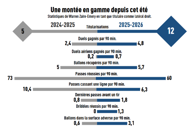 L’attaque parisienne retrouve des forces, Ousmane Dembélé (attaquant de 28 ans) et Désiré Doué (milieu/attaquant de 20 ans) enchaînent enfin. Cela permet d’avoir une belle dose de talent et de créativité en plus. Ainsi qu’une meilleure répartition du temps de jeu, alors que Bradley Barcola (23 ans) et Khvicha Kvaratskhelia (24 ans) tiraient la langue à la fin de l’année 2025. Il faut espérer que les bonnes nouvelles continuent et que le PSG retrouvera un groupe complet ou presque dans les prochaines semaines (Lee Kang-In, Matvey Safonov et Quentin Ndjantou sont encore blessés).