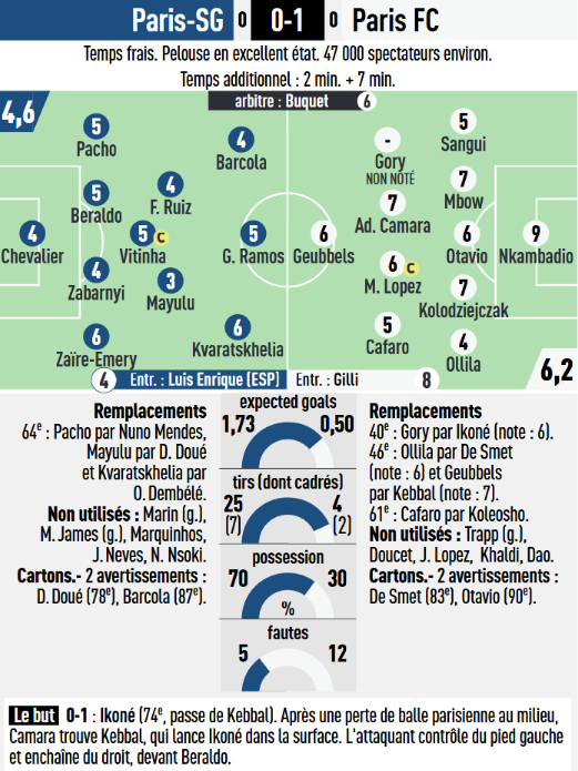Le PSG a eu largement assez d’occasions afin de s’imposer, largement qui plus. Cependant, l’efficacité fait aussi partie du football. Sur ce point, le Paris FC a été meilleur. Ce n’est pas à négliger, c’est ce qui fait la différence entre victoire et défaite sur ce match. Les Parisiens peuvent particulièrement s’en vouloir qu’ils ont parfois gâché par des choix plus orientés vers le spectacle individuel que l’efficacité collective. Ce qui finit souvent par se payer, surtout quand il y a une couche de maladresse en plus.