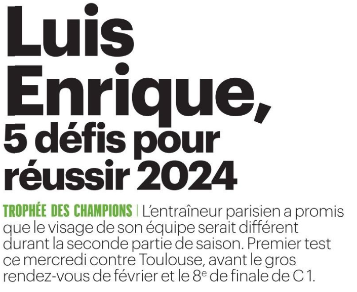 Ce mercredi 3 janvier, la presse française (sur l’aspect sportif) s’est concentrée du côté du Paris Saint-Germain sur le Trophée des Champions 2023 à jouer ce soir contre Toulouse au Parc des Princes. Il y a donc les équipes probables, mais aussi la gestion de Kylian Mbappé (attaquant de 25 ans en fin de contrat en juin prochain) et les 5 défis pour Luis Enrique pour cette seconde partie de saison.