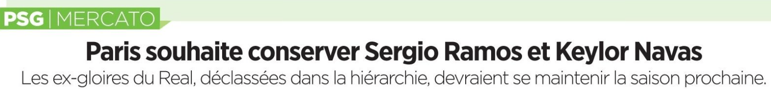 Dans cette revue de presse, on ne retrouve pas beaucoup d’articles sur le Paris Saint-Germain. C’est le grand jour de la finale de la Ligue des Champions, les regards sont braqués dessus. Mais Le Parisien a tout de même évoqué le mercato. Alors que les informations fluctuent sur qui va rester ou non, c’est au tour de Sergio Ramos et de Keylor Navas d’être cités. Les deux joueurs qui ne devraient pas avoir un rôle central la saison prochaine, devraient tout de même rester à Paris, c’est en tout cas la volonté du club.