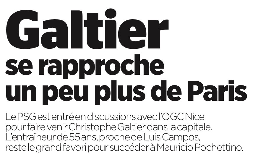 Après la saga Mbappé, il y a la saga des entraîneurs. Christophe Galtier semble tenir la corde, mais ce n’est pas encore sûr. Évidemment, il y a d’autres discussions, sinon Galtier aurait déjà probablement signé. De plus, impossible d’avancer sans un accord pour le départ de Mauricio Pochettino, ce qui explique le flou ambiant autour de Paris. L’Équipe rappelle que Galtier a toujours défendu le PSG depuis l’arrivée du Qatar et se montre toujours respectueux envers le club parisien.