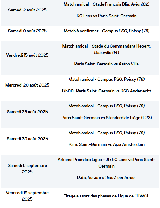 Après la reprise de l’entraînement le 16 juillet, l’équipe Féminine du Paris Saint-Germain a un beau programme afin de préparer la saison 2025-2026 avec notamment plusieurs matchs amicaux d’ici au début de la Première Ligue Arkéma le weekend du 6 septembre contre Lens. Le PSG a publié un communiqué officiel afin d’annoncer son calendrier complet.