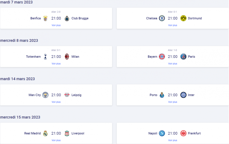 Cette semaine, ont été joués les premiers 8es de finale allers de la Ligue des Champions 2022-2023, avec 1 club français qui était concerné. Le Paris Saint-Germain recevait en effet le Bayern Munich mardi soir au Parc des Princes et s’est incliné 0-1 (avant le retour le 8 mars). Retrouvez ci-dessous l’ensemble des rencontres allers de ce tour (avec les résultats de cette semaine et les matchs de la prochaine), les retours étant les 7-8 et 14-15 mars :