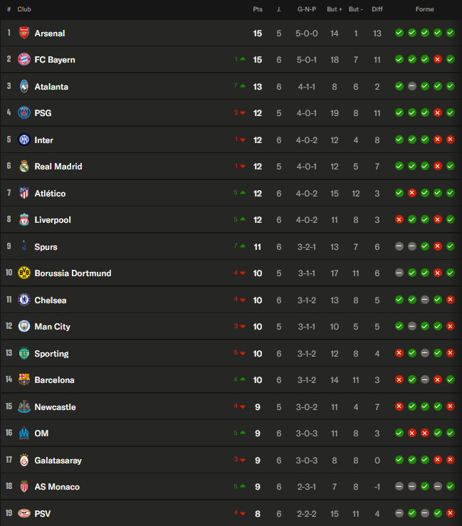 Cette semaine se joue la 6e journée de la phase de ligue de la Ligue des Champions, avec notamment le Paris Saint-Germain qui joue ce mercredi soir contre l’Athletic Bilbao au Stade San Mamés ce mardi. Voici les résultats des premiers matchs avant ceux joués mercredi.