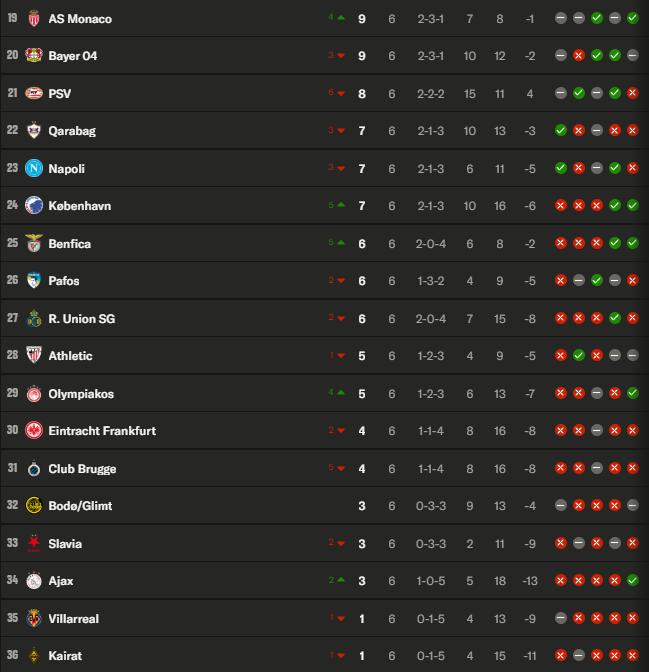 25e à 36e : élimination de toutes les compétitions européennes.