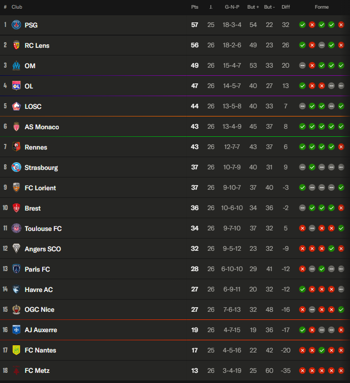 Ligue 1 - Ce qu'on retient de la 25e journée : Lens rattrape Paris, l'OM 3e