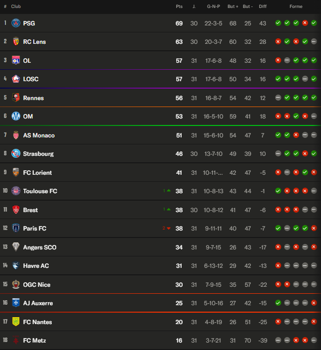 Les Lyonnais ont ainsi défendu leur 3e place (il pourrait même y avoir un petit rêve de 2e place surprise), alors que Lille reste au même nombre de points et avec une égalité à la différence de buts grâce au succès difficile et précieux sur la pelouse du Paris FC. Rennes a aussi dû batailler dans le derby face à Nantes, mais a fini par trouver les solutions, dans le temps additionnel, pour rester collés. Tout en écartant la concurrence.
