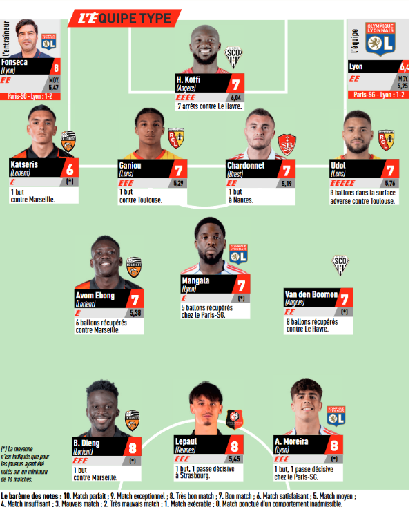 Comme après chaque levée de championnat, L’Équipe a établi son équipe-type de la 30e journée de Ligue 1 2025-2026 qui s’est jouée ce week-end (retrouvez les résultats et le classement ici). Avec sa défaite 1-2 contre l’Olympique Lyonnais (résumé vidéo PSG/Lyon) au Parc des Princes, le Paris Saint-Germain voit aucun de ses joueurs être sélectionné. Il y a en revanche 2 Lyonnais.