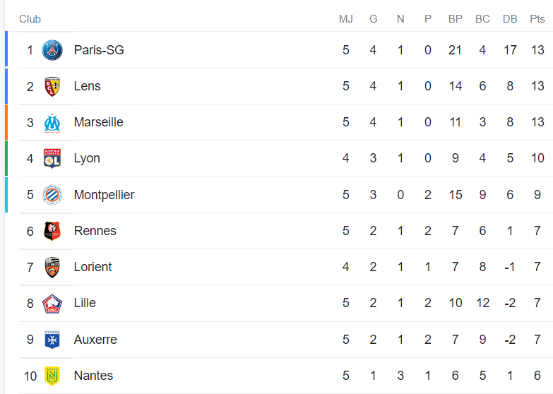 Le PSG, l’OM, Lens, et l’OL réussissent un parcours remarquable avec 1 match nul et que des victoires, sauf que Lyon a un match en retard. Le PSG n’est pas seul en tête même s’il domine à la différence de but, +17 contre +8 pour Lens et Marseille, les coleaders. Les Parisiens ont largement dominé le match.