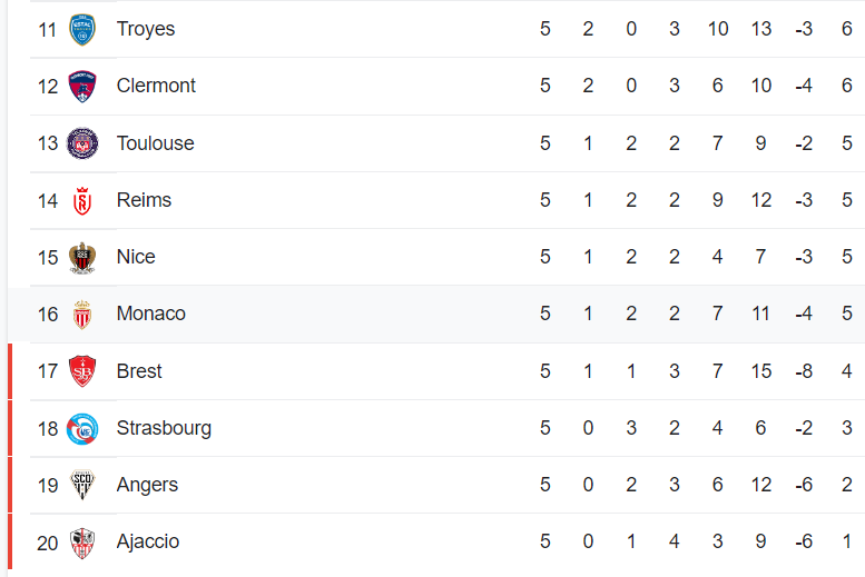 Ajaccio est toujours dernier et cela devient inquiétant avec 1 point en cinq matchs. Monaco est 16e après une lourde défaite contre Troyes. Nice se relance et remonte à la 15e place. Dans le haut du tableau, Lens impressionne et Marseille suit le rythme.