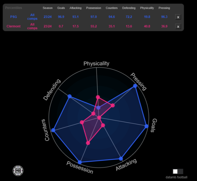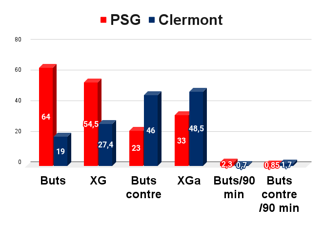 Le Paris Saint-Germain reçoit le Clermont Foot ce samedi à 21h pour le compte de la 28 journée de Ligue 1. C’est un match entre le leader (PSG) et le 18e. L’écart est abyssal, meilleur attaque contre pire attaque, l’une des meilleures défenses contre l’avant-dernière dans ce domaine. On a regardé les statistiques des deux équipes dans de nombreux domaines, il y a pas mal de points intéressants à noter.