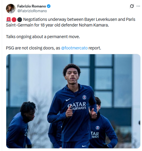 Noham Kamara, défenseur de 18 ans sous contrat au Paris Saint-Germain jusqu’en 2028, a été annoncé sur le départ pour ce mercato hivernal. Il a notamment été question d’une discussion avec l’Olympique Lyonnais, possiblement pour un prêt. Foot Mercato et le journaliste Fabrizio Romano annoncent ce vendredi que le Titi pourrait finalement être vendu au Bayer Leverkusen.