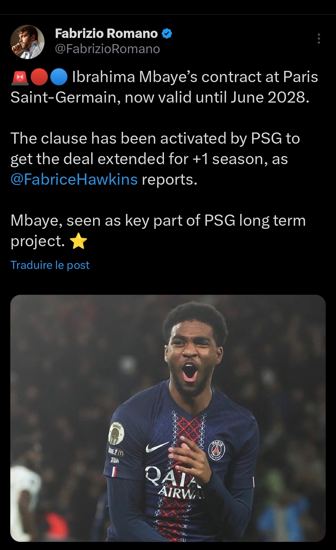 Ce journaliste n’a pas pour habitude d’être aussi affirmatif sans certitude, on peut donc penser que Mbaye a bien obtenu cette prolongation de contrat. Un beau signe de confiance, amplement mérité après une montée en puissance très intéressante ces derniers mois. Il reste du travail afin de peaufiner son jeu et gagner en efficacité. C’est logique à son jeune âge, il y a surtout des promesses et l’espoir d’une belle histoire au PSG.