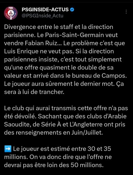 Fabian Ruiz, milieu âgé de 28 ans du Paris Saint-Germain arrivé durant l’été 2022 en provenance de Naples, sort d’une saison par moments très intéressante, mais qui n’enlèverait pas tous les doutes pour une place à Paris. Il y a en effet des rumeurs pour ce mercato estival 2024. D’après Foot PSG Inside Actus, une offre importante est arrivée et une vente est voulue par lz direction mais pas le coach Luis Enrique.