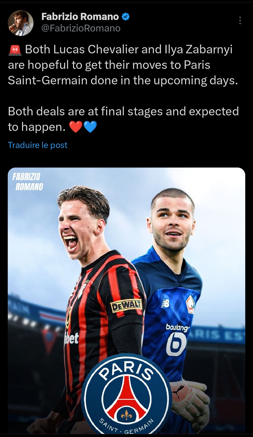 Cela avec des recrutements qui rentre bien dans le projet depuis 2023, de jeunes talents déjà prêts pour le haut niveau et qui peuvent encore grandir avec de grandes choses à accomplir. Attendons tout de même avant de nous réjouir, on a déjà bien vu que le timing exact est difficile à prédire pour les journalistes lors du mercato. Ce serait positif que Chevalier et Zabarnyi soient Parisiens pour la reprise de l’entraînement ce mercredi 6 août.