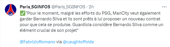 Il n’y a rien de sûr tant que ce n’est pas officiel, car on sait que le mercato peut aller très vite et surprendre. Cependant, la tendance est clairement à voir Bernardo Silva continuer à City. Possiblement avec une prolongation. Une signature au PSG serait aujourd’hui une surprise. On espère surtout que la direction arrivera à avancer davantage avec ses autres pistes.